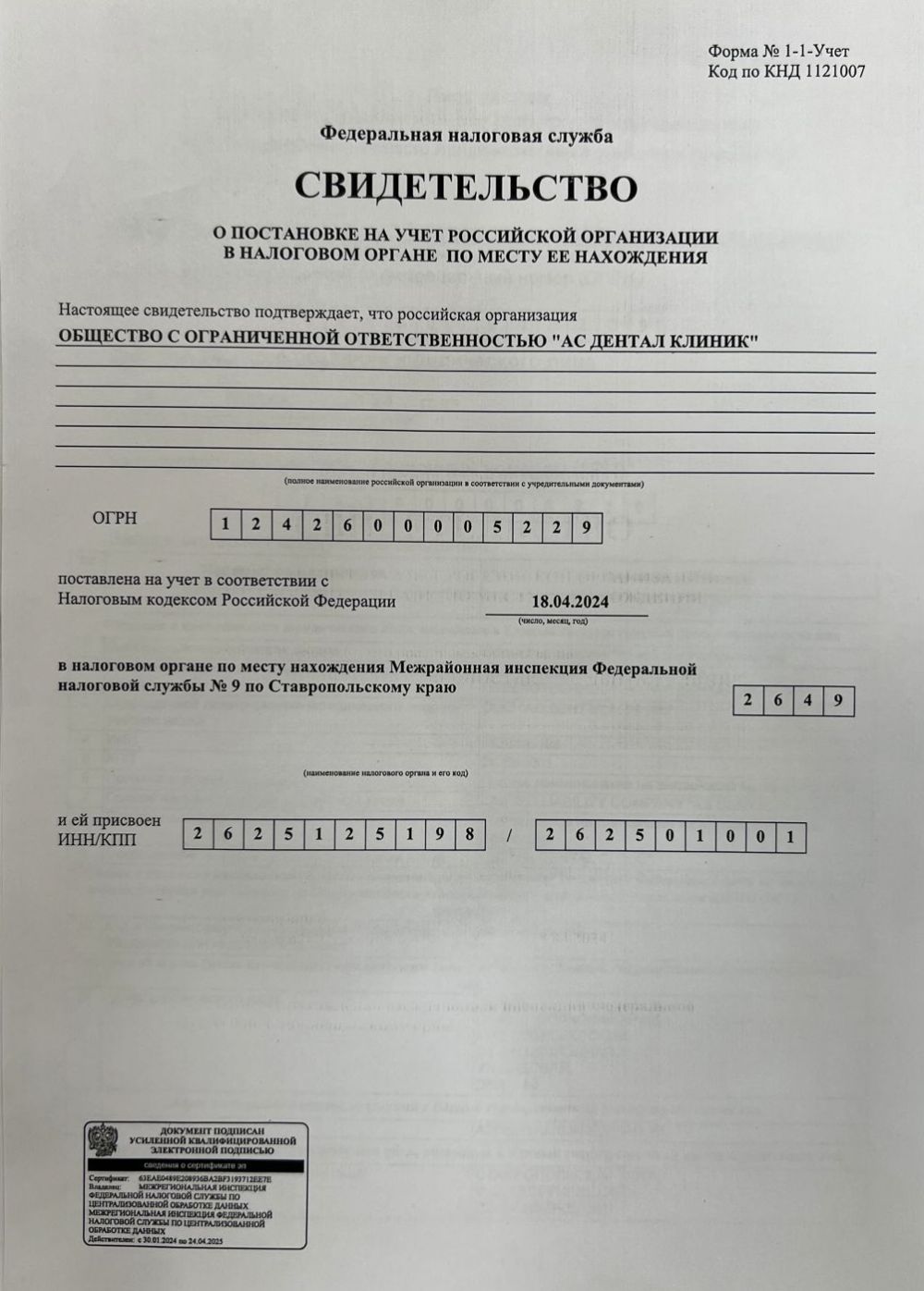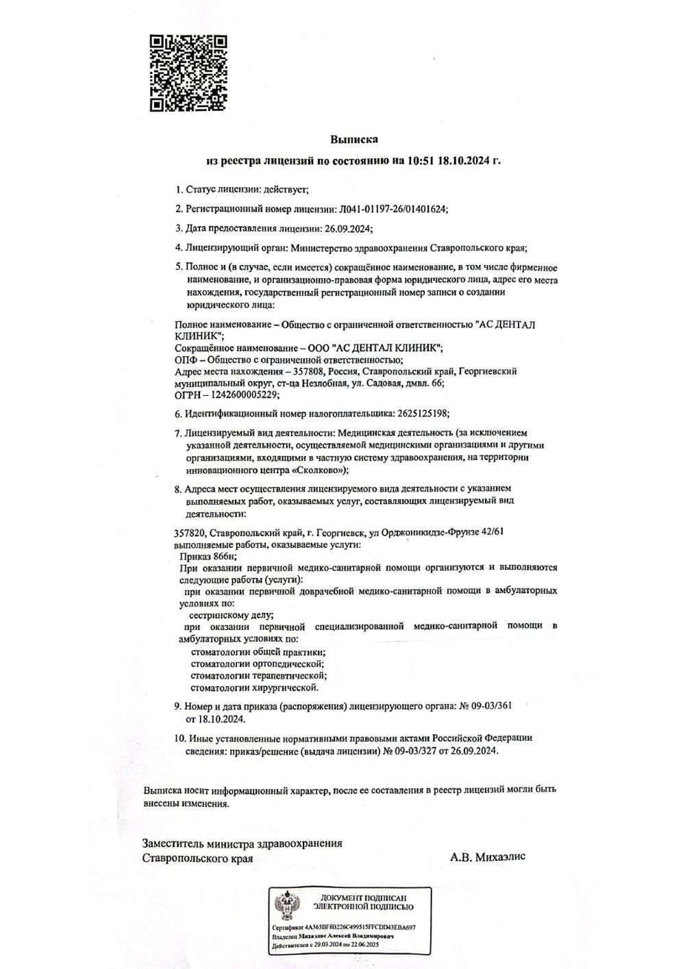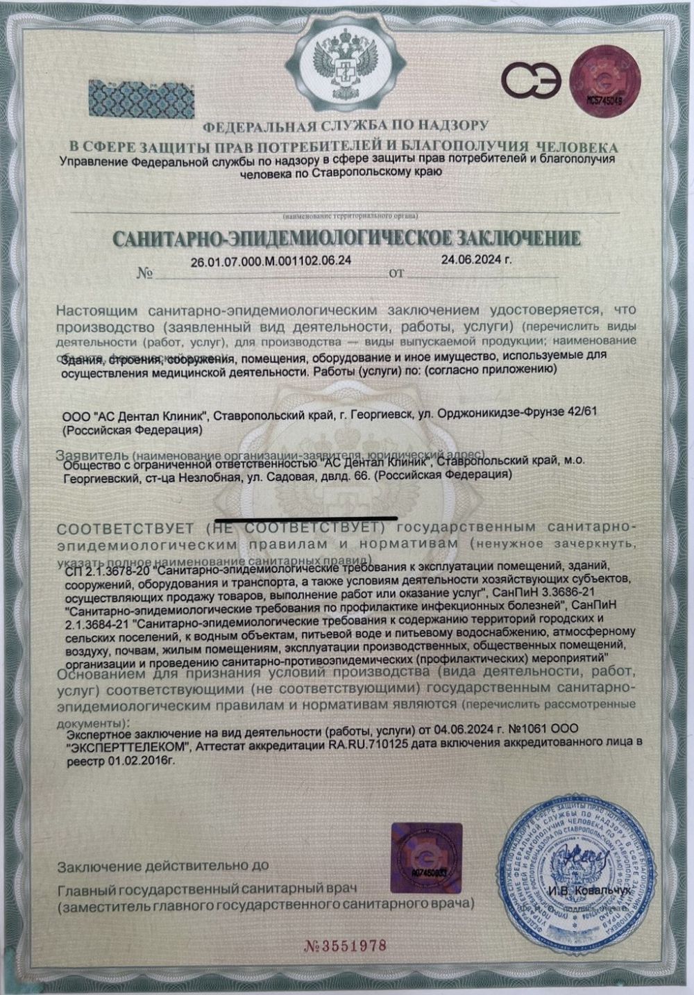 OOO «АС ДЕНТАЛ КЛИНИК». Лицензия № ЛО41-01197-26/01401624 выдана Министерством здравоохранения Ставропольского края 26.09.2024г. ИМЕЮТСЯ ПРОТИВОПОКАЗАНИЯ. НЕОБХОДИМА КОНСУЛЬТАЦИЯ СПЕЦИАЛИСТА.